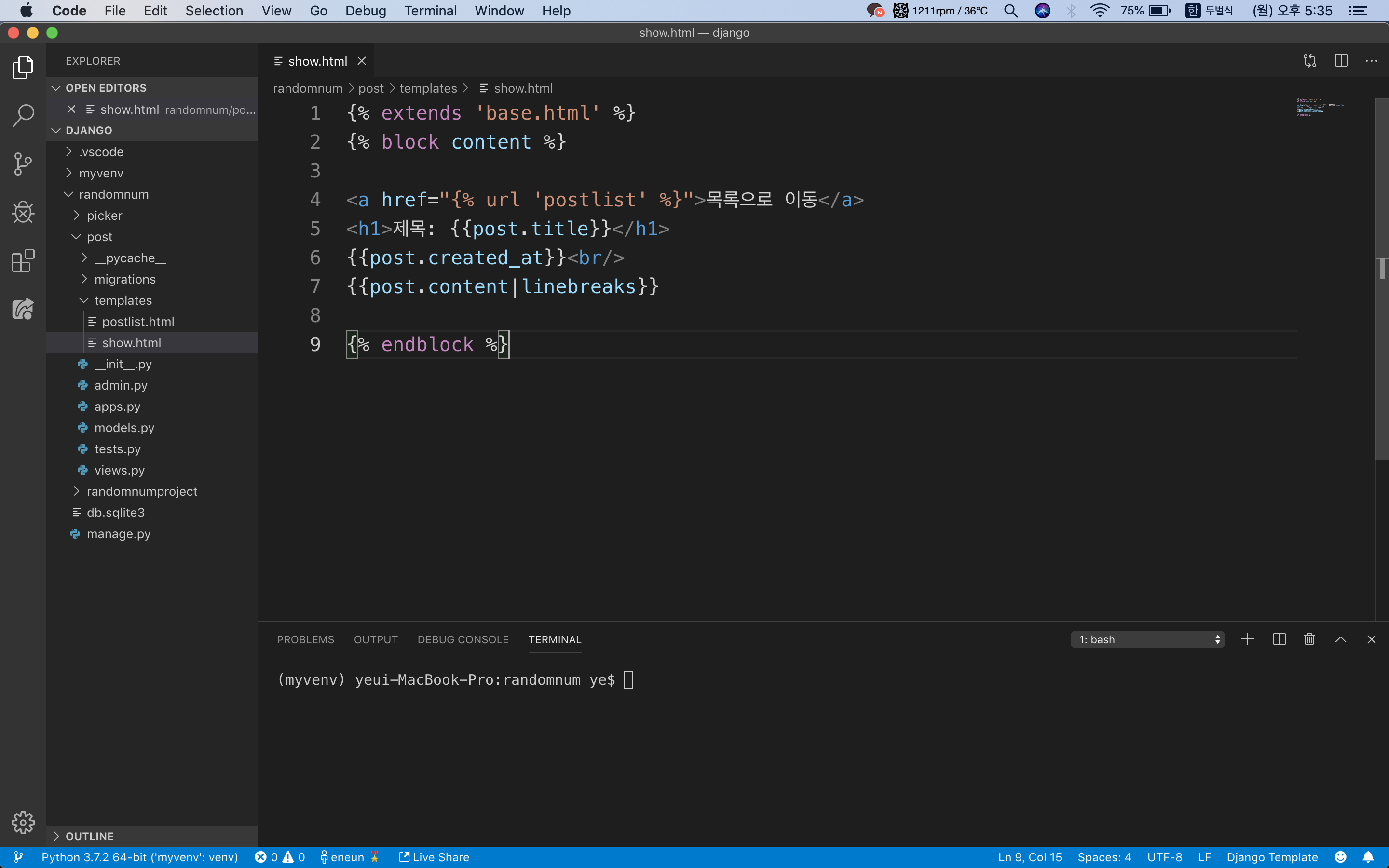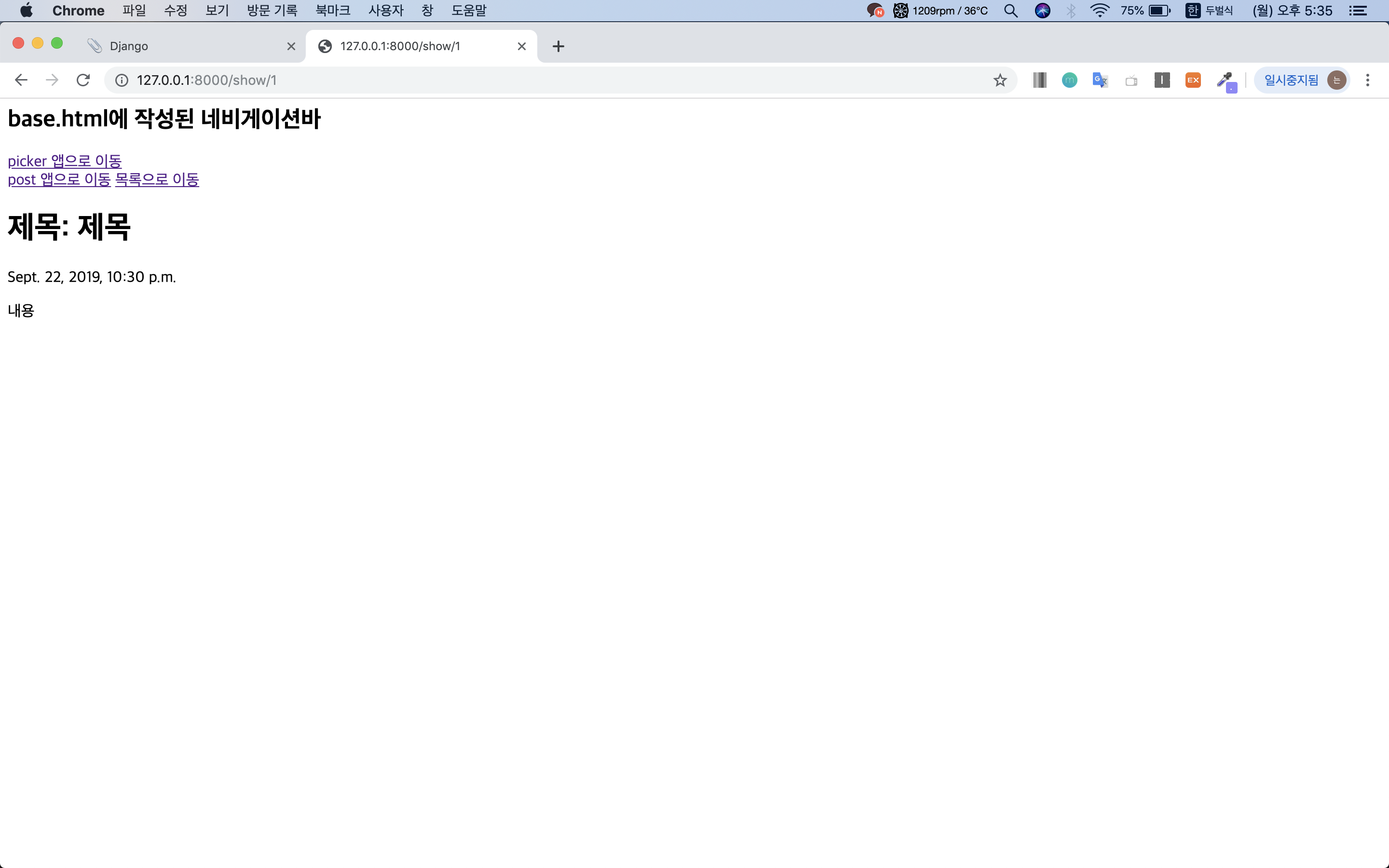 - {% extends 'base.html' %} : base.html을 상속받겠다는 의미