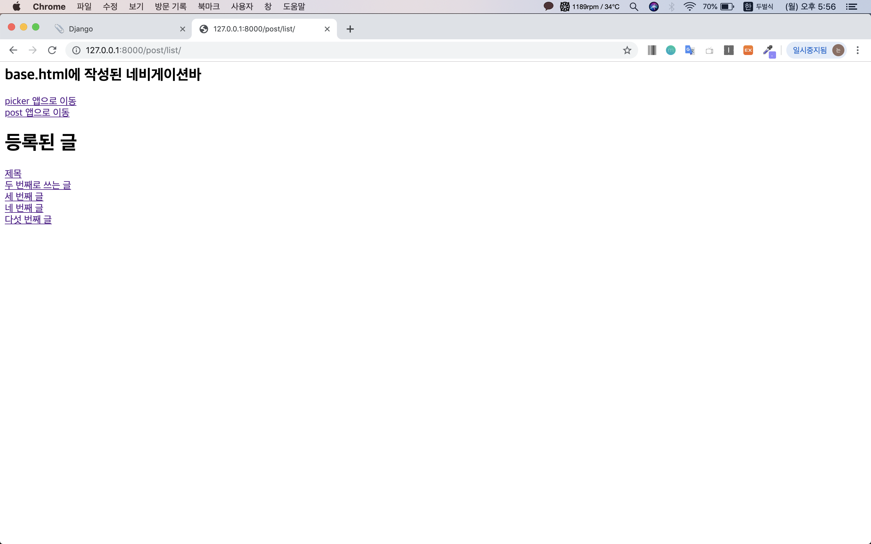 서버를 돌려서 도메인 뒤에 'post/list/'를 붙여보면 postlist.html 페이지가 잘 나타납니다.